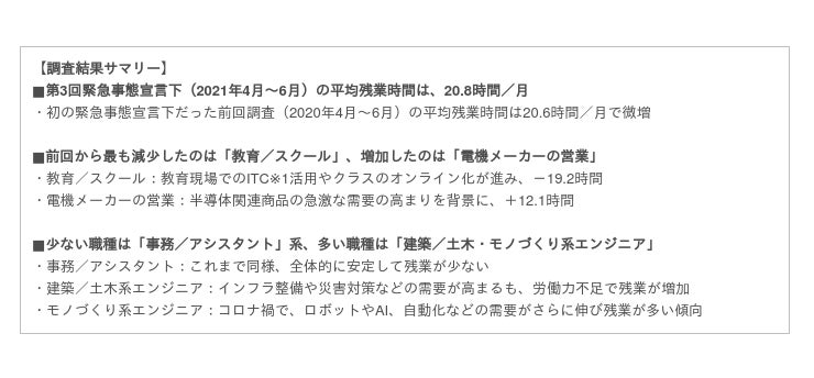 2021年4月〜6月の3カ月の平均残業時間は、全職種の平均が20.8時間/月で、前回の20.6時間とほぼ変わらない結果となりました。