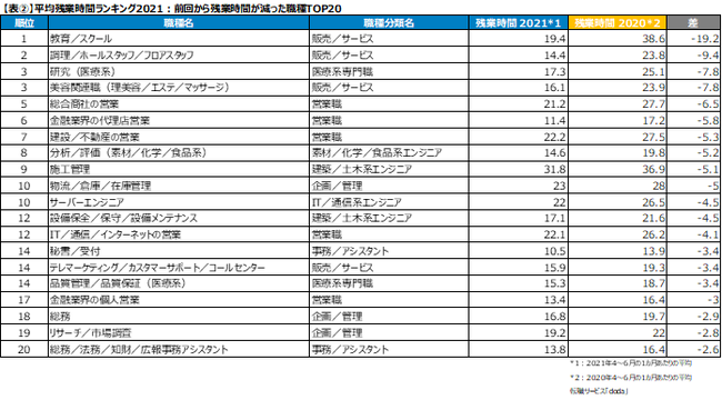 「教育/スクール」は残業時間が最も減少し、残業時間が多い職種55位に