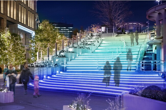 ・昨年と同じ灯具を用いてグラデーションカラーを表現。また日比谷ステップ広場の「HIBIYA WINTER SQUARE」に使用されるツリーボックスや、プランターは再利用可能なものを使用し、廃棄物を減らします。