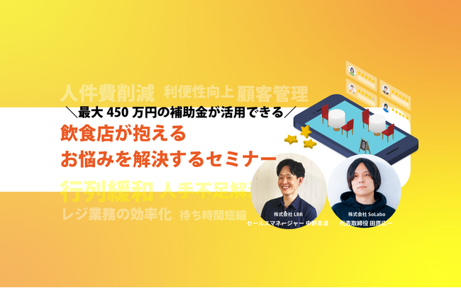 株式会社SoLabo(本社:東京都千代田区、代表取締役:田原広一)は、株式会社LBB(本社:大阪府大阪市、代表取締役:宮本敦史)と共同で、飲食店の抱える人材不足の解消や集客・売上向上を目指すためのノウハウを紹介するオンラインセミナーを開催します。