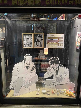 会場にはパチンコ「沼」の盤面を大胆にプリントしたアパレルや、「賭博黙示録カイジ」や「賭博破戒録カイジ」の名勝負シーンのアクリルフィギュア、地下強制労働施設で行われた地下チンチロリンの茶碗などカイジグッズを圧倒的販売!ほかにも、大槻班長、利根川、一条、兵藤会長などクセモノ揃いの名キャラクターたちの商品や、あなたも「帝愛」の一員になれる世界観を完全再現したオリジナルアイテムなどを多数取り揃えています・・っ。