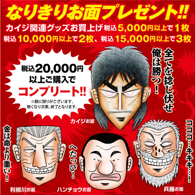 「墓場昇天録カイジ展 POP UP STORE」開催期間内に関連グッズを税込5,000円以上お買上げごとにカイジ、トネガワ、ハンチョウ、兵藤のなりきりお面をプレゼント!税込5,000円以上で1枚、税込10,000円以上で2枚、税込15,000円以上で3枚、20,000円以上でコンプリート!