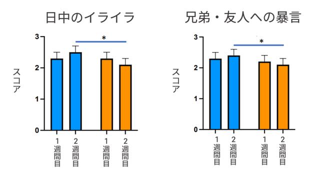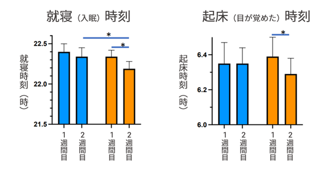 その結果、唾液中のメラトニン濃度に影響はありませんでしたが、就寝前3時間のブルーライトカットメガネ装用によって、一般的なメガネ装用時と比べ、就寝時刻と起床時刻が早くなり、その効果は2週間目に顕著になりました。起床時刻はブルーライトカットメガネ装用によって1週間目に比べて2週間目で早くなりました。また、日中のイライラ感や兄弟・友人への暴言のスコアが、一般的なメガネ装用時と比べて2週間目で減少しました。