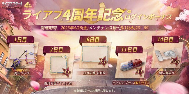 4月28日から5月11日までの14日間、ゲームにログインするだけで、4周年記念限定アイコン枠、名刺枠、アイコンなどがもらえます。ぜひ、この機会をお見逃しなく!