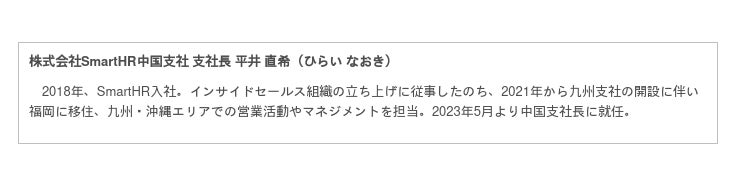 クラウド人事労務ソフト「SmartHR(スマートエイチアール)」を運営する株式会社SmartHR(本社:東京都港区、代表取締役CEO:芹澤 雅人、以下「当社」)は、事業拡大に伴い、2023年5月1日に「中国支社」を開設いたします。東京本社・関西支社・九州支社・東海支社に続き、国内5つ目の拠点であり、支社長には当社インサイドセールスチームの立ち上げや九州支社の新規販路開拓に従事した平井 直希が就任いたします。