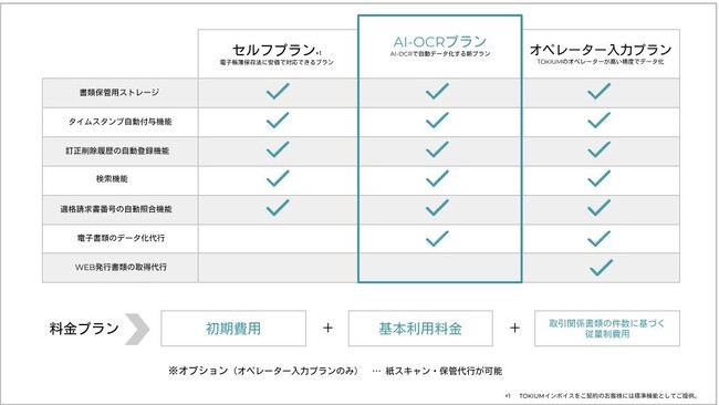 TOKIUMは、納品書や契約書などのあらゆる取引関係書類をクラウド上で管理し、電子帳簿保存法に容易に対応できる「TOKIUM電子帳簿保存」を提供しています。これまで、取引関係書類の日付や金額などのデータを自社で入力するプランと、オペレーターがデータ化するプランを提供していましたが、価格も抑えながら入力作業を軽減したいというご要望にお応えするため、AI-OCRを採用した新プランを新設しました。