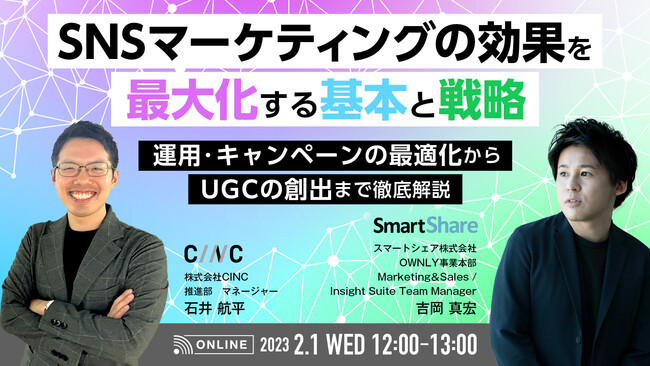 株式会社CINC(シンク、以下CINC)は、2023年2月1日(水)にスマートシェア株式会社とオンラインセミナー『SNSマーケティングの効果を最大化する基本と戦略 〜運用・キャンペーンの最適化からUGCの創出まで徹底解説〜』を開催いたします。