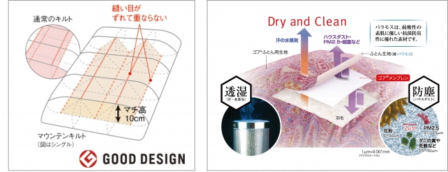 東洋羽毛は羽毛ふとんの特長である「保温性」「吸湿放湿性」を最大限に発揮できるよう、羽毛ふとんのキルトや生地にもこだわりを持って製造しています。冬はあたたかく、夏はかいた汗をすばやく吸湿・放湿することで、ふとんの中を蒸れにくく快適に保つことができます。
