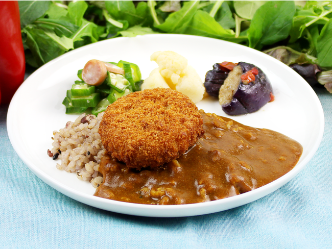 カレーハウスCoCo壱番屋の低糖質※でスパイシーなカレーソースを使用したビーフカレーです。お米は玄米を使用した16穀米です。トッピングはジューシーなメンチカツをご用意いたしました。