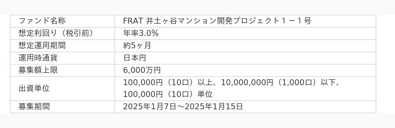 本ファンドは、投資家の皆様からの出資金を『株式会社FRAT(フラット)』に対し、販売用不動産購入資金、建築用資金および関連諸費用として貸付け運用するファンドです。