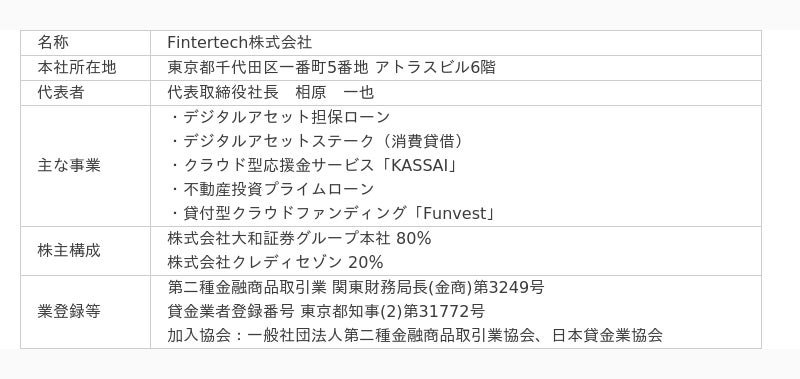 Fintertechは、大和証券グループ及びクレディセゾンがそれぞれ創業来培ってきた金融ビジネスのノウハウを礎としながら、最先端のテクノロジーの活用や外部企業との連携により次世代金融サービスを機動的にかつ柔軟に創出することを目指しています。 主な事業として、暗号資産を活用した「デジタルアセット担保ローン」及び「デジタルアセットステーク(消費貸借)」、クラウド型応援金サービスの「KASSAI」、「未来をわかちあう投資」を提供する貸付型クラウドファンディングサービス「Funvest(ファンベスト)」を展開しています。