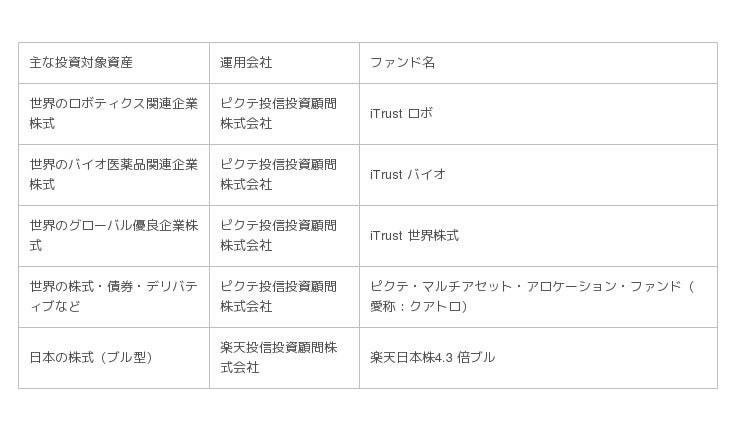 今回はインターネット専用ファンド「 iTrustシリーズ」 全3本がラインアップに加わったほか、さまざまな資産に分散投資する「ピクテ・マルチアセット・アロケーション・ファンド(愛称:クアトロ)」、日々の基準価額の値動きが日本の株式市場の値動きに対して概ね4.3 倍程度となることを目指す「楽天日本株4.3 倍ブル」をセレクトいたしました。