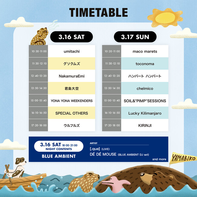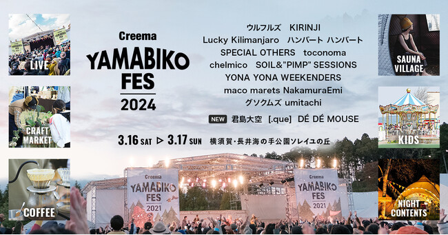 株式会社クリーマ(本社:東京都渋谷区、代表取締役社長:丸林耕太郎)は、2024年3月16日(土)・17日(日)神奈川県横須賀市の「長井海の手公園 ソレイユの丘」にて開催する「Creema YAMABIKO FES 2024(クリーマ ヤマビコフェス 2024)」の追加出演アーティスト3組決定に伴い、全16組のアーティスト最終ラインナップとタイムテーブルを公開しました。また、新企画となる3/16(土)限定・夜のカルチャーコンテンツ“BLUE AMBIENT”の詳細含め、フェスの全コンテンツを一挙公開いたします。