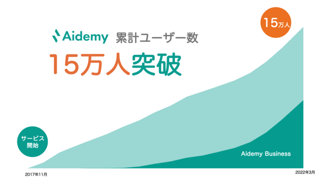 Aidemyは2017年12月にサービスをローンチし、約3ヶ月後の2018年3月には1万人のユーザー数を記録、その後2021年2月に10万人に到達しました。