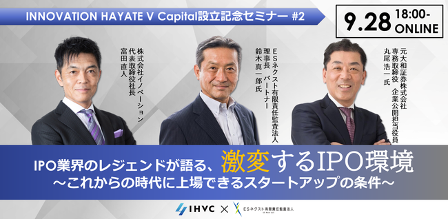 本セミナーではINNOVATION HAYATE V Capitalの設立を記念して、ハンズオンパートナーであるESネクスト有限責任監査法人の鈴木氏と500社を超える企業のIPOに関わってきた、元大和証券IPO担当役員丸尾氏をお招きし数多くのスタートアップの上場を支援し、見届けてきたからこそ語れる、“激変するIPO環境〜これからの時代に上場できるスタートアップの条件〜”についてお話しいただきます。