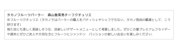 新宿高野B1のフレッシュバーにて発売期間は、7月1日〜9月末日までの毎週土日となります。またデザートメニューのほか、ワイン売り場にて夏限定のシャンドン パッション オリジナルギフトが7月1日から発売されます。