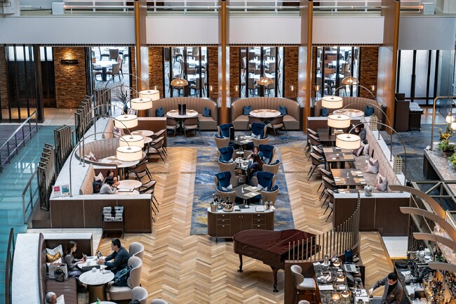 6層分の吹き抜けの開放的なアトリウムは、朝は爽やかな陽射しが差し込み夜はキャンドルライトがきらめく心地よい空間に。長さ26メートルのガラスブリッジが美しく光を反射します。ブレックファストからランチ、ディナーと旬の食材を最大限に活かしたアートのようなプレゼンテーションで優雅な時間を演出します。