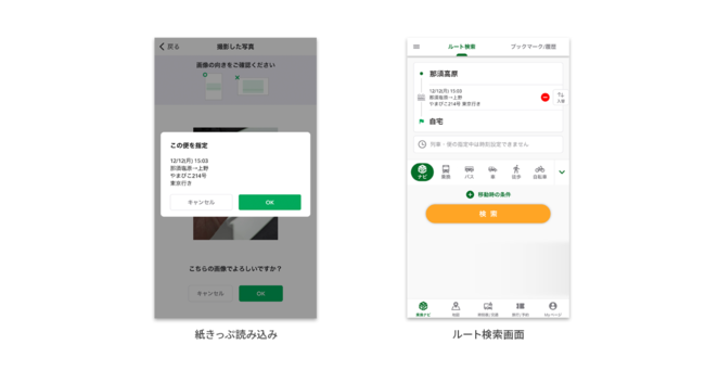 アプリ内に列車情報が取り込まれ、紙きっぷに記載されている列車を指定したルートを検索することができます。