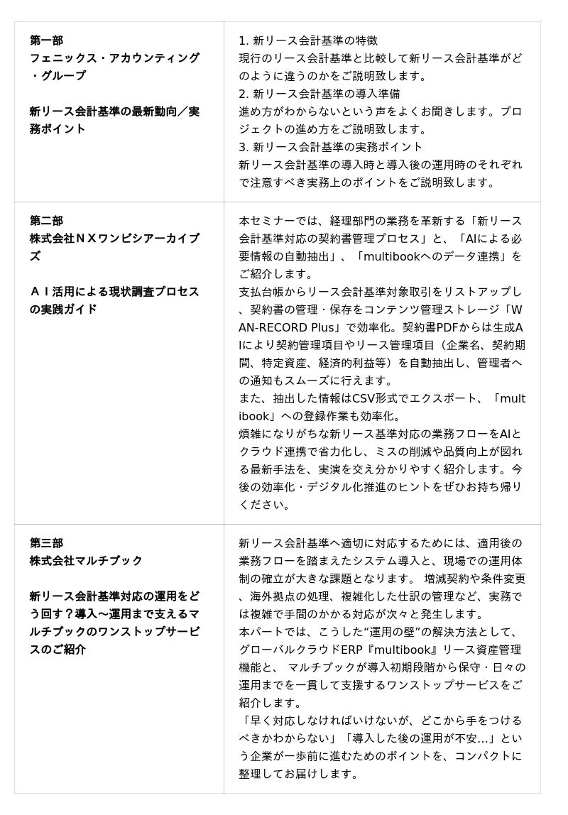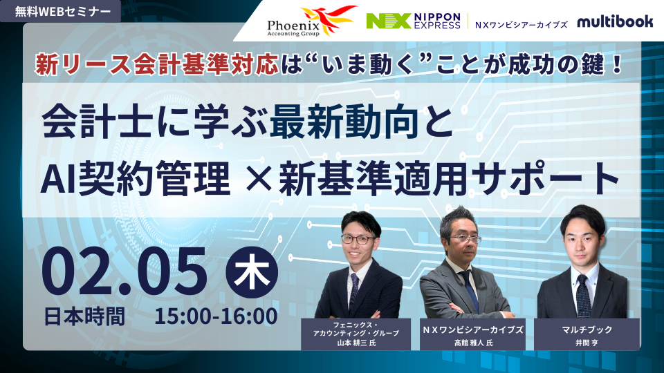 グローバルクラウドERPサービス「multibook(マルチブック)」を提供する株式会社マルチブック(東京都品川区、代表取締役社長:渡部 学)は、フェニックス・アカウンティング・グループ、株式会社NXワンビシアーカイブズとの共催Webセミナー、『新リース会計基準対応は“いま動く”ことが成功の鍵!会計士に学ぶ最新動向とAI契約管理 ×新基準適用サポート』を開催いたします。