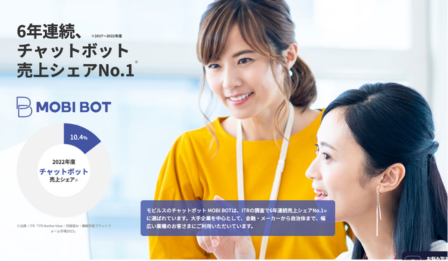 The Support Tech Companyとして顧客サポート支援のソリューションを開発・提供するモビルス株式会社(本社:東京都港区、代表取締役社長:石井智宏)は、株式会社アイ・ティ・アール(以下、ITR)が発行した市場調査レポート「ITR Market View:対話型AI・機械学習プラットフォーム市場2023」において、2022年度チャットボット市場ベンダー別売上金額シェア1位を獲得したことをお知らせします。