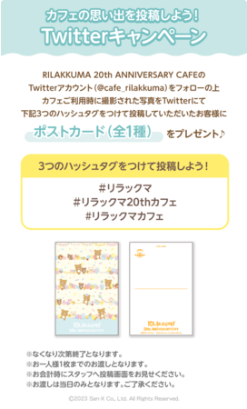 ■Twitterキャンペーン:「RILAKKUMA 20th ANNIVERSARY CAFE」のTwitterアカウント(@cafe_rilakkuma)をフォローの上カフェご利用時に撮影された写真をTwitterにて3つのハッシュタグをつけて投稿いただいたお客様に「ポストカード(全1種)」をプレゼント!