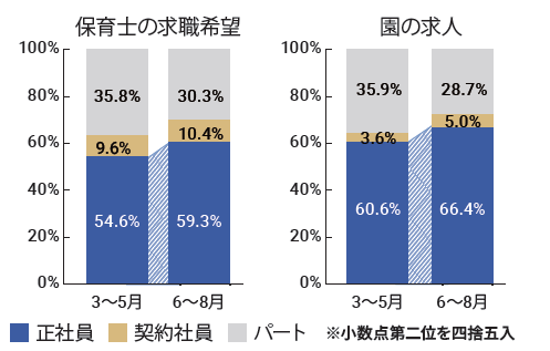 保育士バンク!の利用実績をもとに、直近3か月の保育士求職者の希望と園の募集要件で、正社員・契約社員・パートの雇用形態の割合を算出、 前期間と比較。