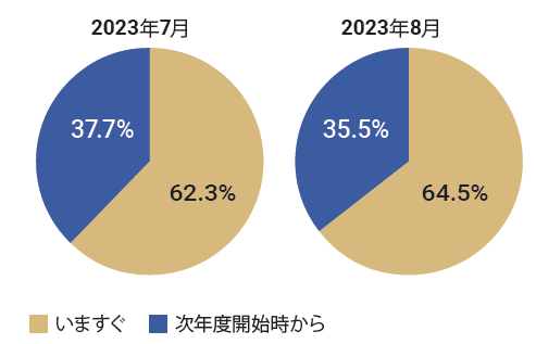 保育士バンク!の利用実績をもとに、当月の園の募集要件で、入職する タイミングが「いますぐ」なのか「次年度開始時」なのかの割合を算出、 前月と比較。