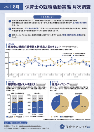 保育業界に特化した調査・研究を行う機関「保育士バンク!総研」を運営する株式会社ネクストビート(本社:東京都渋谷区、代表取締役:三原誠司)は、当社が展開する保育士・幼稚園教諭向け転職支援サービス「保育士バンク!」の利用実績をもとに、保育士の就職活動の実態調査を実施いたしました。この度、調査結果をまとめましたので、概要をお知らせします。