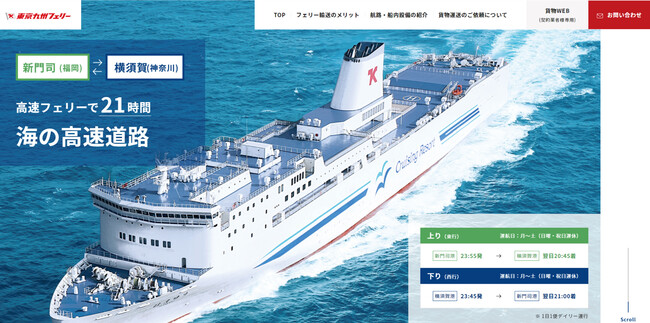 東京九州フェリー株式会社(本社:福岡県北九州市、代表取締役社長:小笠原 朗)は、この度、貨物ホームページを全面リニューアルしました。今回のリニューアルでは、東京九州フェリーの魅力を見やすく、分かりやすくお伝えするホームページに改善して、モーダルシフトや物流業界の2024年問題の課題解決に役立つ情報を掲載しています。