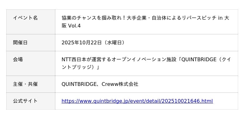 NTT西日本が運営するオープンイノベーション施設「QUINTBRIDGE(クイントブリッジ)」にて、大企業と自治体が登壇し参加企業とのタッチポイントを創出