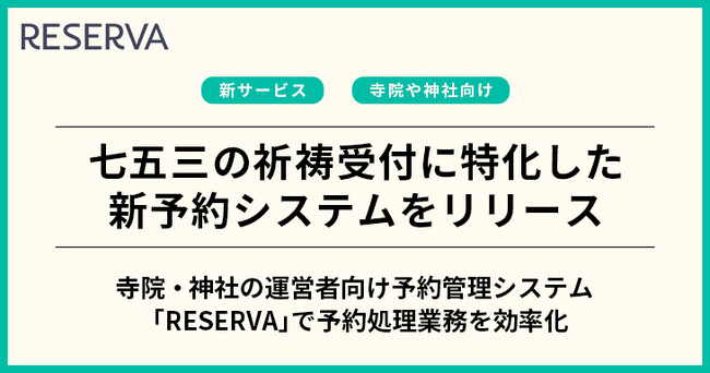 RESERVA(https://reserva.be)は、観光業や宿泊業など350業種以上に対応した業界最大級の予約システム。年間5,000件を超えるイベント・行事のほか、近年は寺院や神社での導入が進み、初参りやお宮参りをはじめとした行事・儀式に活用されている。今回は、2023年内に限らず2024年の七五三にも向けて、寺院・神社側からより効率的な行事運営体制を敷きたいとの要望を受けて、七五三の祈祷予約に特化したシステムのリリースに至った。