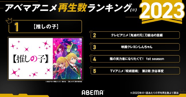「ABEMA」、2023年のアニメジャンル年間ランキングを発表!年間再生数ランキングは『【推しの子】』が、年間コメント数ランキングは『声優と夜あそび 2023』が1位に!