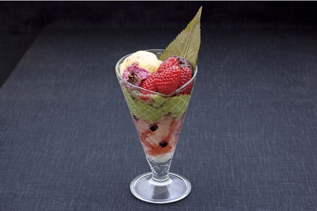 さくらの花びら入りさくらアイスが入った、さくらづくしのあんみつパフェです。