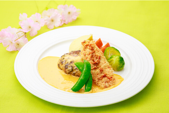 当店自慢のハンバーグに合わせた海老のクリームソースに、さくら海老とチーズで作ったガレットを添え、香ばしい食感をお楽しみいただけます。※各日15食限定