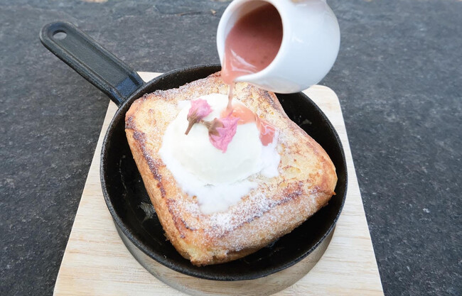 フレンチトーストを鉄板でふっくらと焼き上げ、桜の花びらとアイスをトッピングしました。桜あんソースをかけてお召し上がりください。
