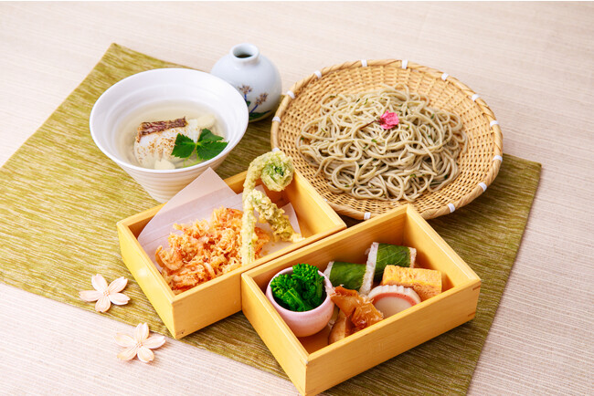 桜の葉を練り込んだお蕎麦は噛むと口の中に桜の香りが広がります。香ばしい桜エビのかき揚げに春の山菜天ぷら、風味の良い桜鯛のお吸い物蕎麦など桜づくしの御膳。春を感じながらお楽しみ下さい。