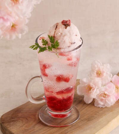 さくら風味のソーダに、自家製クランベリージュレとさくら餅のアイスをトッピング。さくらの塩漬けの塩味がアクセントに。春の香りがふわっと広がる期間限定ドリンクです。