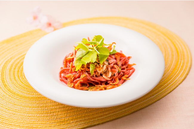 桜を練り込んだ、淡いピンクの自家製麺を使っています。素材の風味を生かすため、シンプルなペペロンチーノに仕上げました。※各日5食限定、ディナーのみ