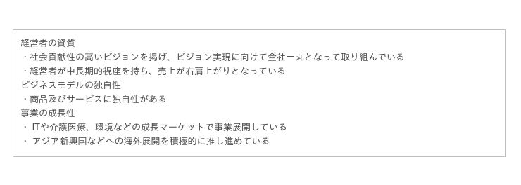 「ビジョン」「成長理由」「売上高」「営業利益」の項目において一定条件を満たした企業を対象とし、「経営者の資質」「ビジネスモデルの独自性」「成長性」をもとに、審査委員による面談や書類審査を経て選出されます。