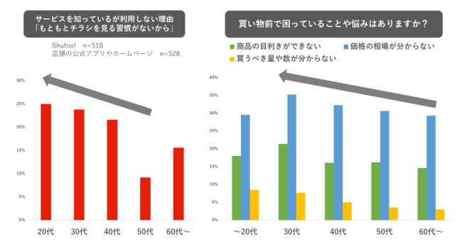 この成長の背景には新聞の購読者数が減少したことで折込チラシの情報ニーズが拡大したことが大きな理由として挙げられますが、一方で、折込チラシ自体になじみのない若年層が増えています。実際に、「Shufoo!を知っているが利用していない」という人を対象にShufoo!を利用しない理由を聞くと、「もともとチラシを見る習慣がないから」と回答した割合が若年層ほど多いことが分かりました。(※3、下図左)また、買い物中に困ることや悩みとして、「価格の相場が分からない」「商品の目利きができない」「買うべき量や数がわからない」と回答した割合が、いずれも若い世代ほど高いことが分かりました。(※4、下図右)