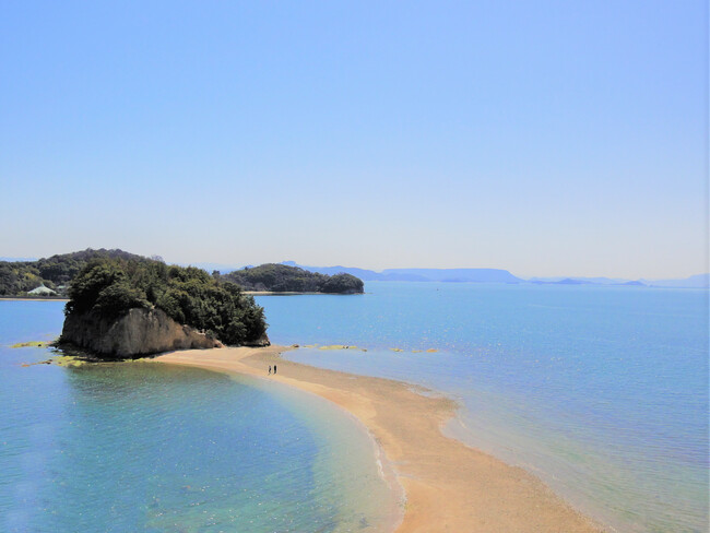 土庄町(とのしょうちょう)は、瀬戸内海の東部に浮かぶ小豆島の北西部に位置する町です。小豆島は、面積は約153平方キロメートルで瀬戸内海では2番目の大きさで、土庄町と小豆島町の2つの行政区でできています。島でギネス世界記録に認定された世界で一番狭い土渕海峡、特産品の手延べそうめんや、豊島石などでも知られています。豊かな自然と多くの特産品を有し、年間約110 万人の観光客が訪れる観光地です。小豆島の中心地で高松や岡山からの船が着く港町。港のバス乗り場近くでは、『二十四の瞳』に登場する大石先生と12人の子どもたちのブロンズ像が観光客を迎えます。小豆島と前島の間にある運河のような「土渕海峡」は、最大幅は400メートルだが最も狭い部分の幅がわずか9.93メートルと、世界一狭い海峡として有名。弁天島から中余島、小余島を介して大余島まで、1日2回、引き潮のときにだけ現れる砂浜が「エンジェルロード(天使の散歩道)」、この砂浜を大切な人と手をつないで渡ると、天使が舞い降りて願いが叶うといわれています。