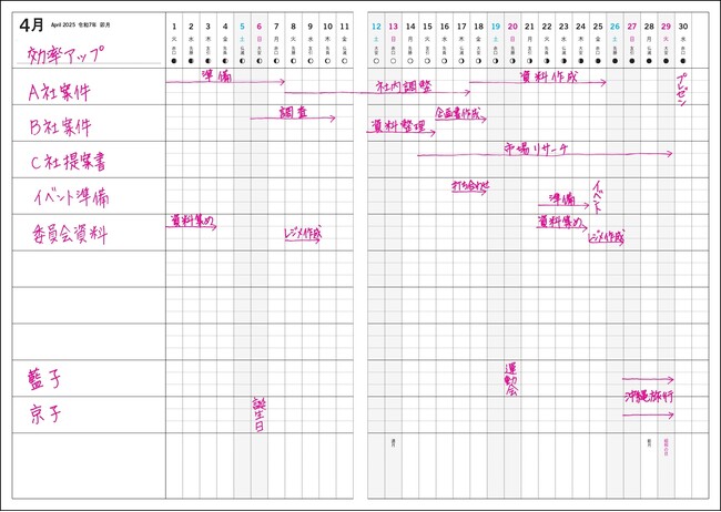 仕事の生産性を上げ、日々の生活を充実させるために最も重要なことは、時間管理です。自分はどんなことに、どれくらい時間を使っているのか。どこにどれだけの時間があれば、やりたいことができるのか。時間を把握し、管理することで、人生は充実したものになります。隂山手帳は、「仕事もプライベートも充実させたい!」という人に、おすすめの徹底的に使いやすさにこだわった手帳。スケジュール管理がしやすいタテ型週間予定ページを中心に、プロジェクト管理表や1行日記など、ビジネスパーソンの欲しい機能がすべて揃っています。普段はデジタルで予定を管理している人でもきっと満足できる使い心地です。