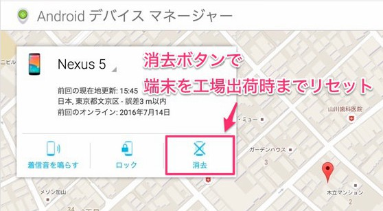 GoogleアカウントはAndroidデバイスを初期化すると強制的にAndroidから削除されます。Androidの「デバイスを探す」と「位置情報」機能がオンであれば、Androidデバイスマネージャーを使ってAndroidを初期化してGoogleアカウントを削除できますが、同時にAndroidに保存されているデータも消去されますのでご注意ください。