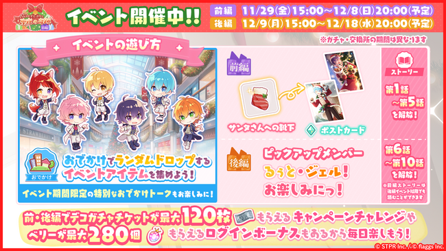 株式会社STPR(本社:東京都渋谷区、代表取締役:柏原 真人、以下STPR)と株式会社flaggs(フラッグス)(本社:東京都品川区、代表取締役CEO:吉江 直人)は、本日11月29日(金)に2.5次元アイドルグループ「すとぷり」の公式ゲームアプリ「すとぷりWith!!(通称:すとうぃず)」のゲーム内イベント「メリークリスマス!すとぷりと聖夜の奇跡 前編」の開催についてお知らせいたします。