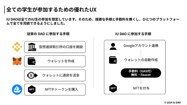 iU DAOは全てのiU生の参加を想定しています。そのため、従来のDAOのようにユーザー側に負担を強いている(もしくは ユーザー側が負担を強いられている)複雑な手順を省き、ひとつのプラットフォームで全てを完結できるようにしています。オンチェーンで活動していくにあたって必要な手数料(GAS代)に関してもダッシュボード上からスマートコントラクトを用いて供給する仕組みを用意しております。ウォレット管理に関しては秘密鍵情報などを運営側で保持せずに運用できるようThirdweb社のSDKを導入しております。