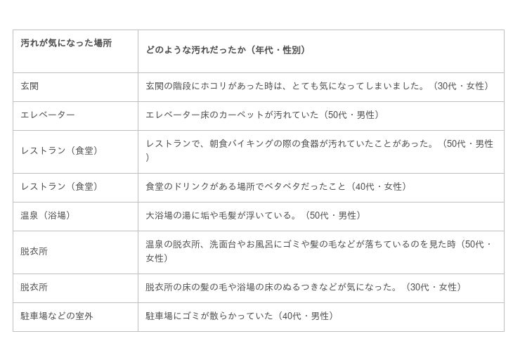 また、「温泉(浴場)」「脱衣所」「廊下」など共有部の汚れを気になったことがある方も多くいました。