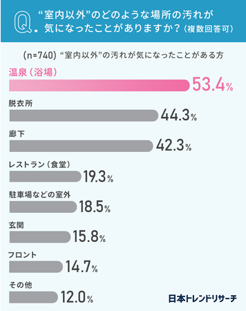 「温泉(浴場)」の汚れを気になったことがある方が53.4%と、もっとも多いようです。