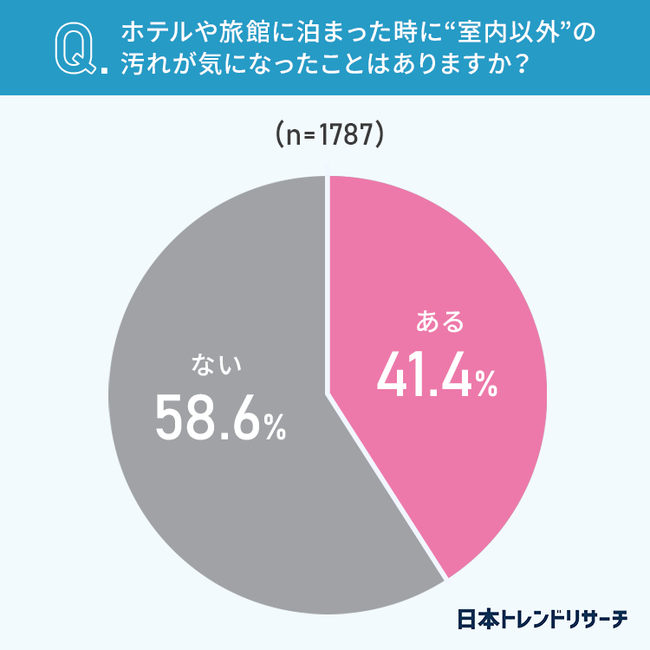 41.4%が、ホテルや旅館に泊まった時に“室内以外”の汚れが気になったことが「ある」と回答しました。