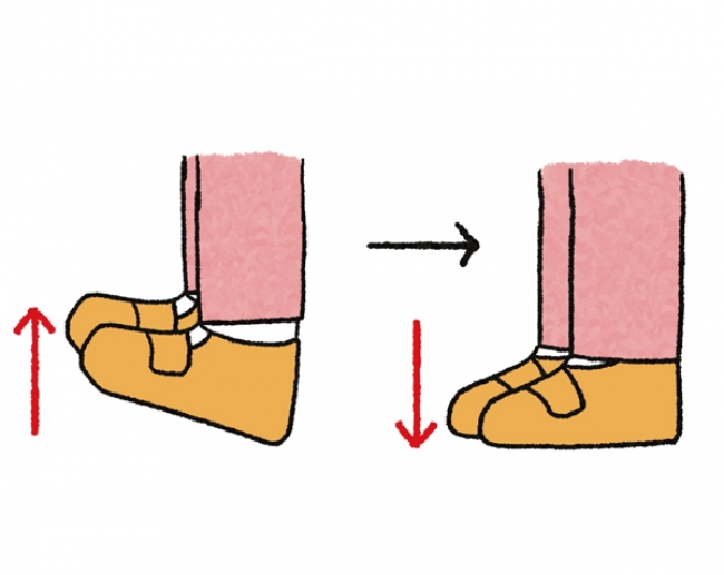 高齢者は、足先が上がらないためにつまずいてしまうことがよくあります。足首を上げる筋肉が働かないと、このようなことが起きやすくなります。トレーニングでは、足先を上げる運動が効果的です。ただし、足先が上がらない原因として、ふくらはぎの筋肉が固くなっていることも多いので、アキレス腱を伸ばすような運動を先に行っておくとよいでしょう。