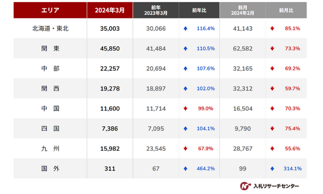 2024年3月のエリア別公示案件数は、エリアにより前年より増加・減少の傾向が分かれました。
